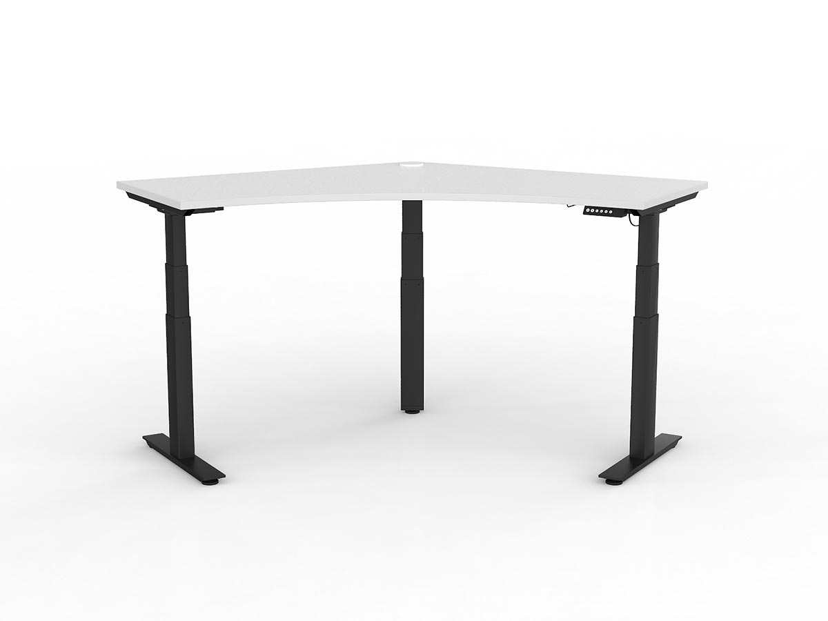 AgileMotion+ is a premium electric height-adjustable desking system engineered for modern Australian workplaces. Featuring dual concealed motors, a four-point memory control with LCD readout, and anti-collision technology, AgileMotion+ delivers precise, programmable height adjustment for sit-stand working throughout the day. The system integrates seamlessly with privacy screens, monitor arms, and personal storage units. This 120° corner workstation configuration provides a large, ergonomically efficient L-shaped workspace with an angled corner join, suited to power users requiring generous desk surface area.