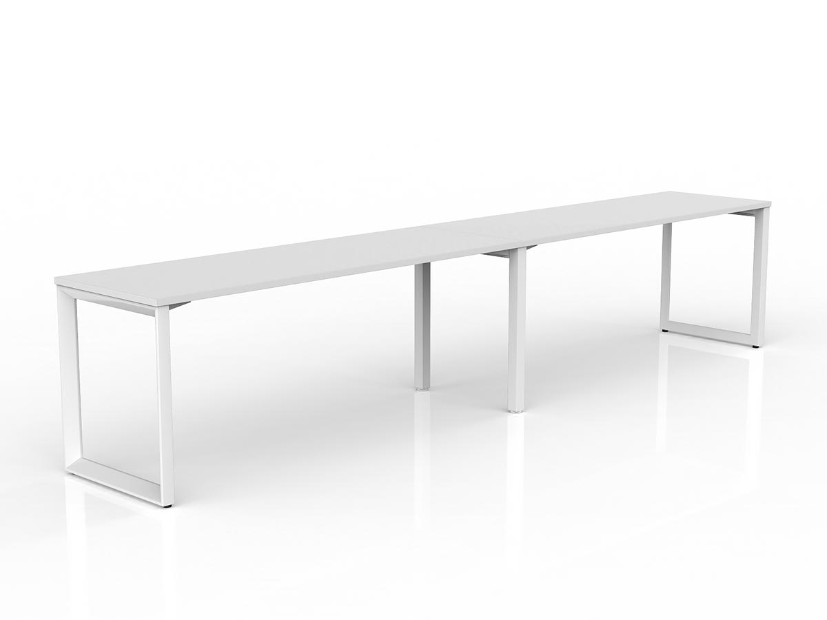The Anvil desking range is a corporate classic featuring a distinctive 50×50mm triangular frame profile that delivers a bold aesthetic as much as a functional workspace. Strong, stable, and modular, each Anvil desk features a fixed height of 730mm with 30mm foot adjustment and is available in a virtually unlimited number of configurations — from straight single workstations through to complex multi-user pod setups. This 2-user single-sided configuration placing two workstations side by side on a shared frame — ideal for paired working or team pods. provides a Single-sided 2-user pod arrangement.