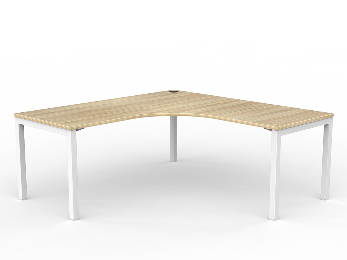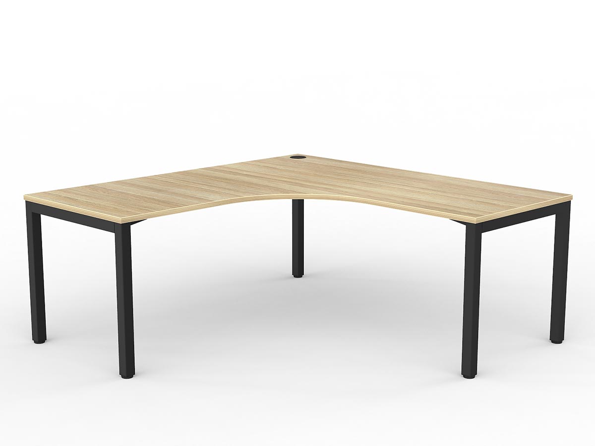 The Axis desking range features a clean, minimalist 50mm square powder-coated frame and fixed height of 715mm with 80mm height adjustment in each foot. Equally at home in open-plan spaces and private offices, Axis is available in Black or White frames and Studio White or New Oak worktops, supporting an infinite range of individual, cluster, and pod configurations. This configuration provides a 90° corner (single user) arrangement.