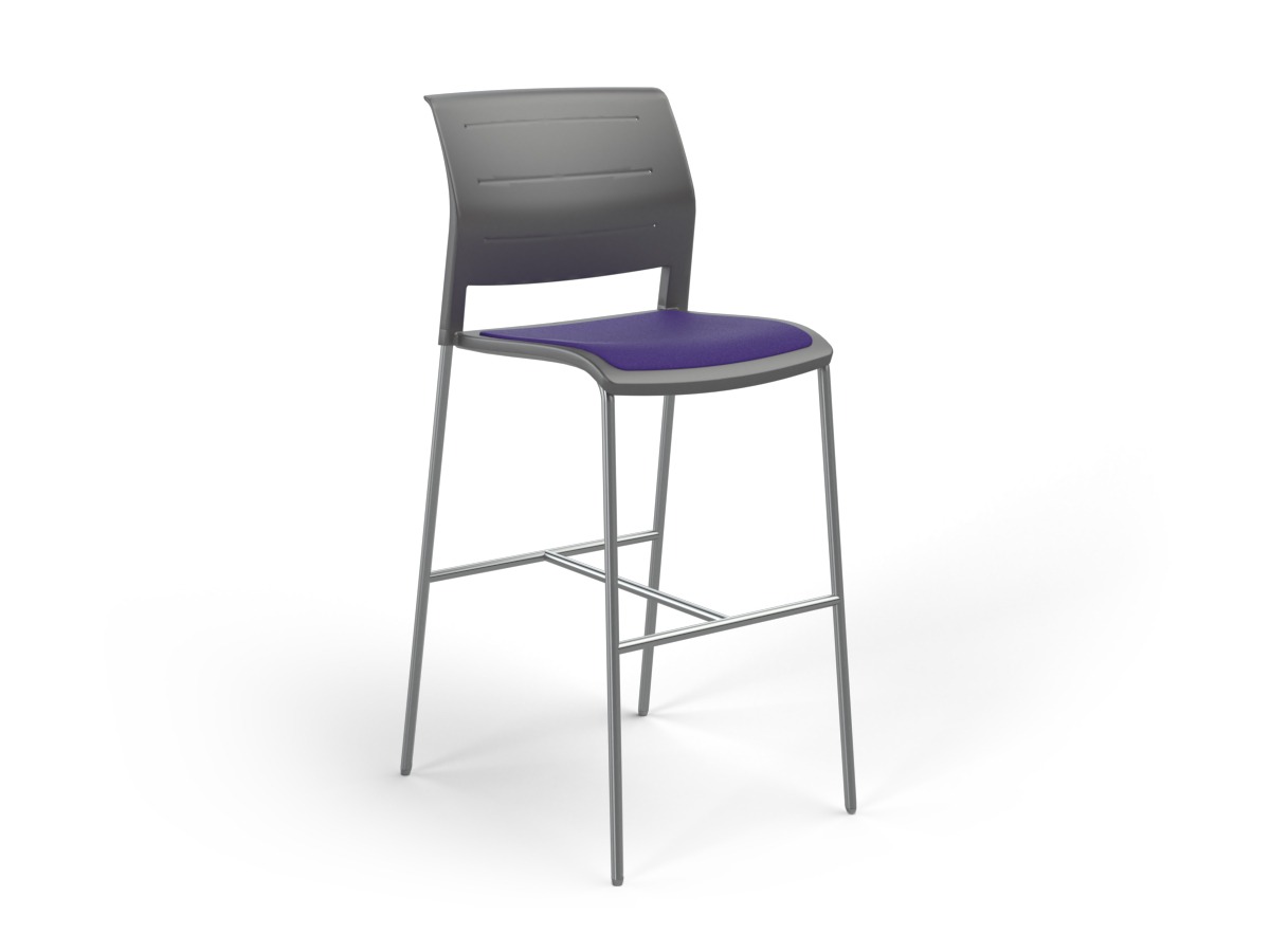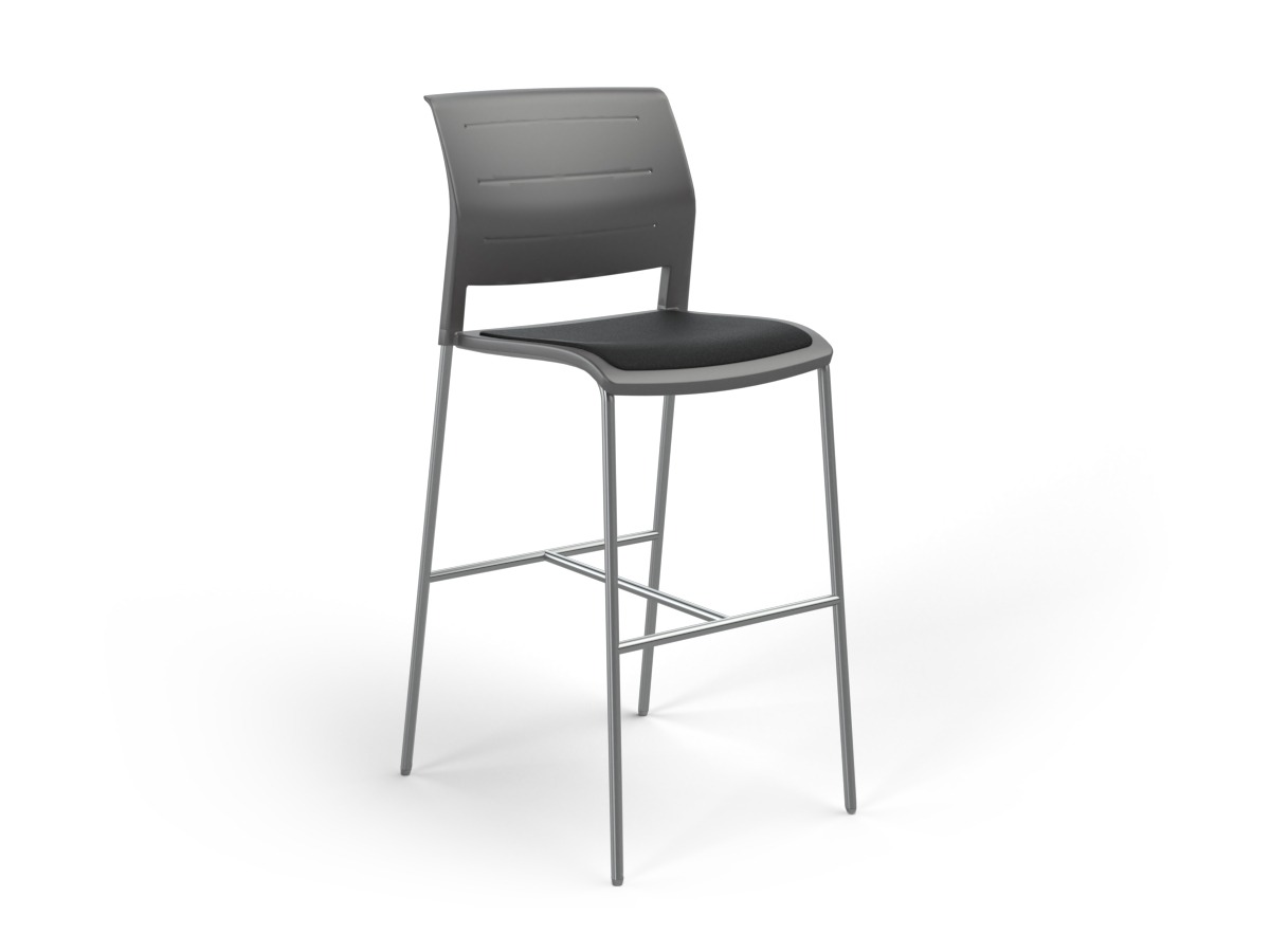 The Game Chair Barstool with Seat Pad adds an upholstered seat pad to the bar-height Game Chair Barstool, providing additional comfort for longer-duration use at bar leaners, high tables, and standing-height collaborative zones.