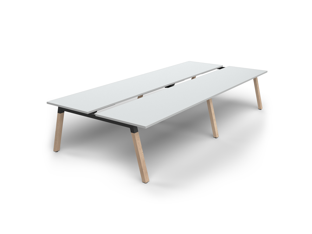 The Plantation desking range brings warmth and organic character to professional workspaces with its distinctive natural solid oak legs and black powder-coated top housing. Perfectly proportioned and ergonomically considerate, the Plantation frame’s turned leg profile maximises knee clearance and under-desk space for pedestals and other accessories. This configuration provides a Double-sided 4-user pod arrangement.