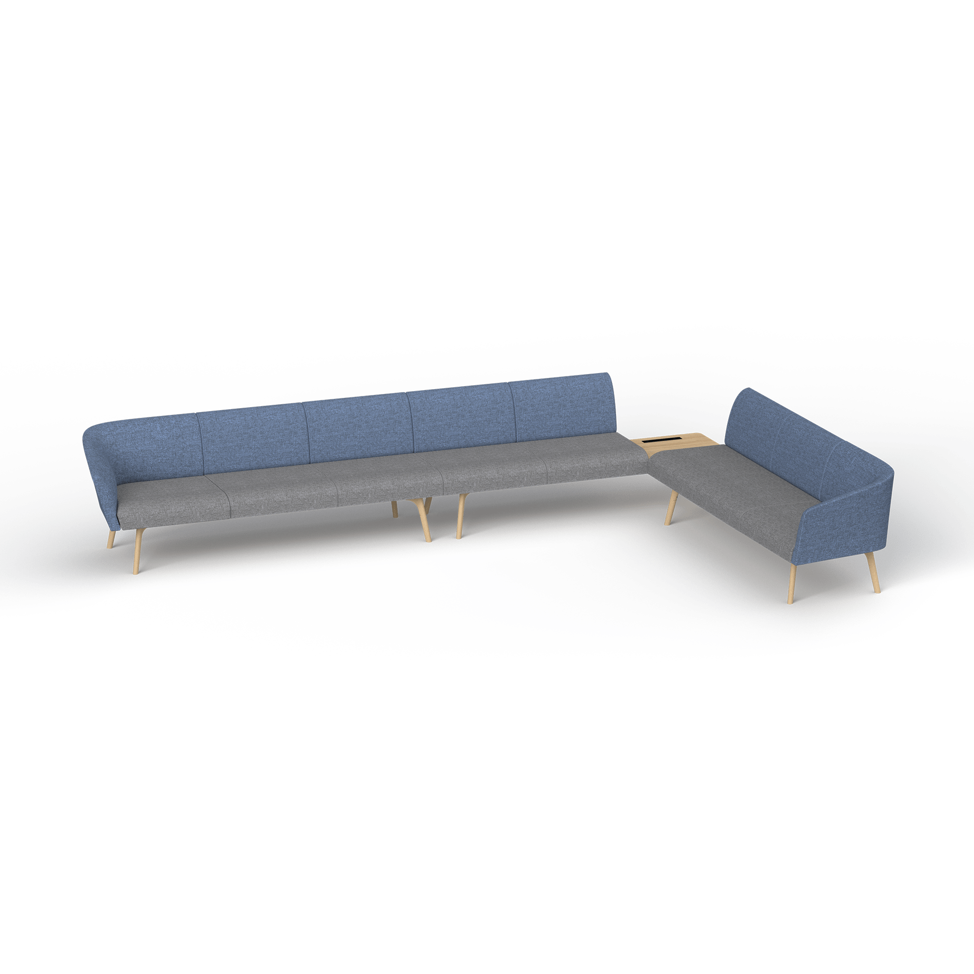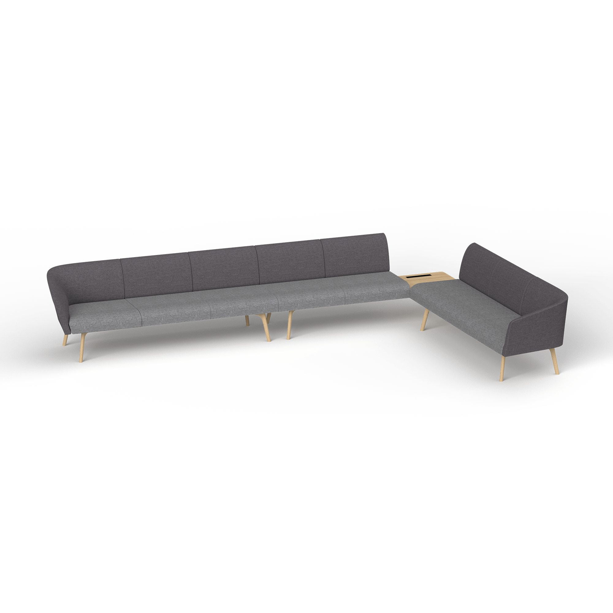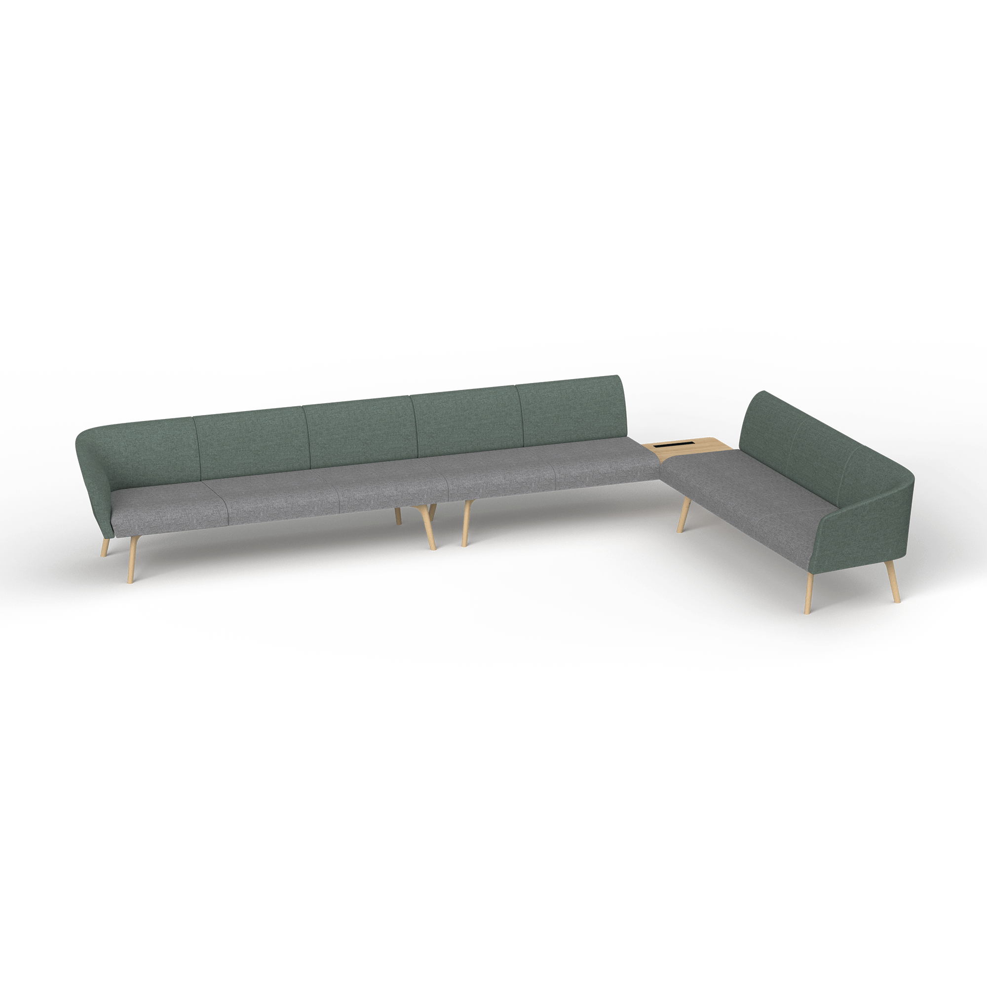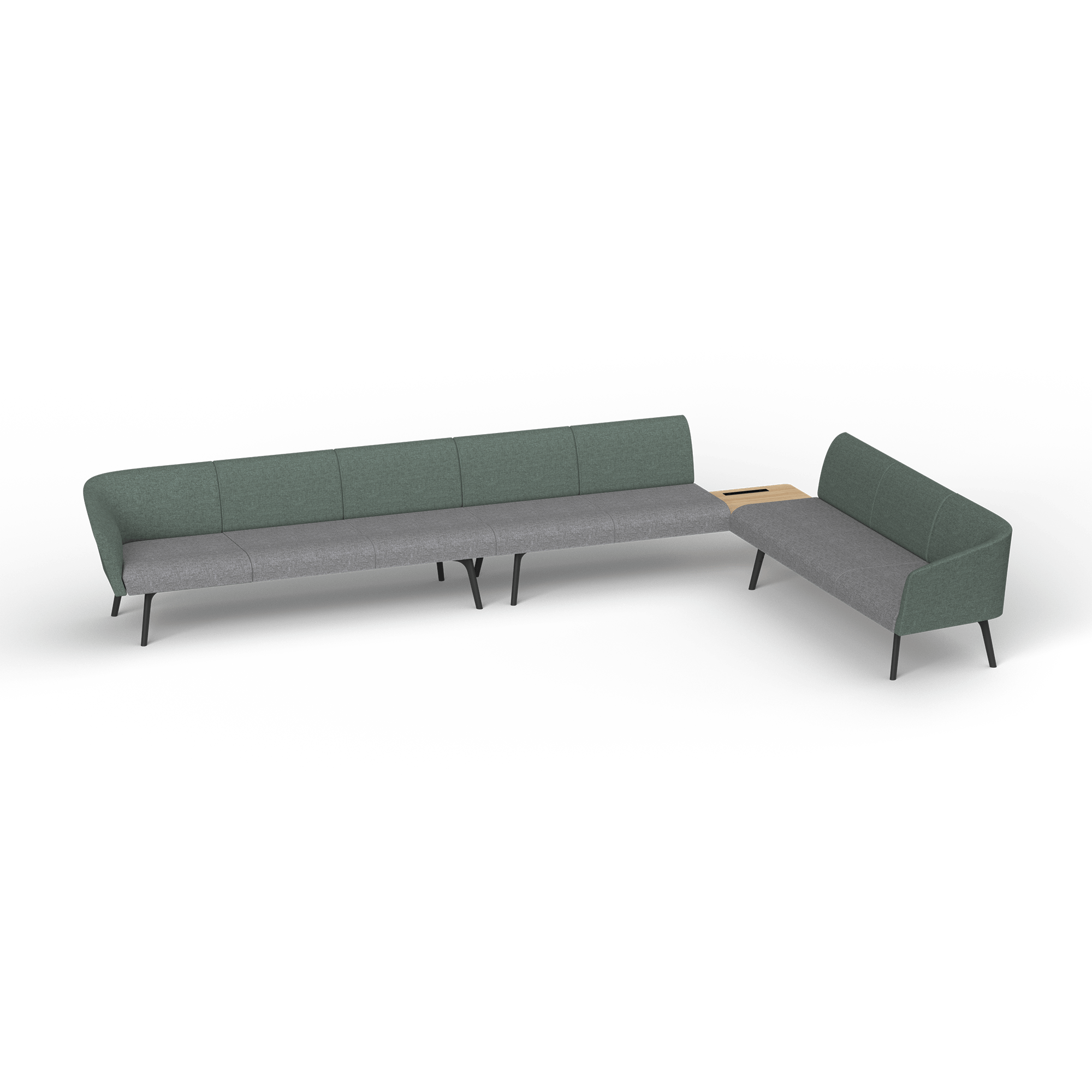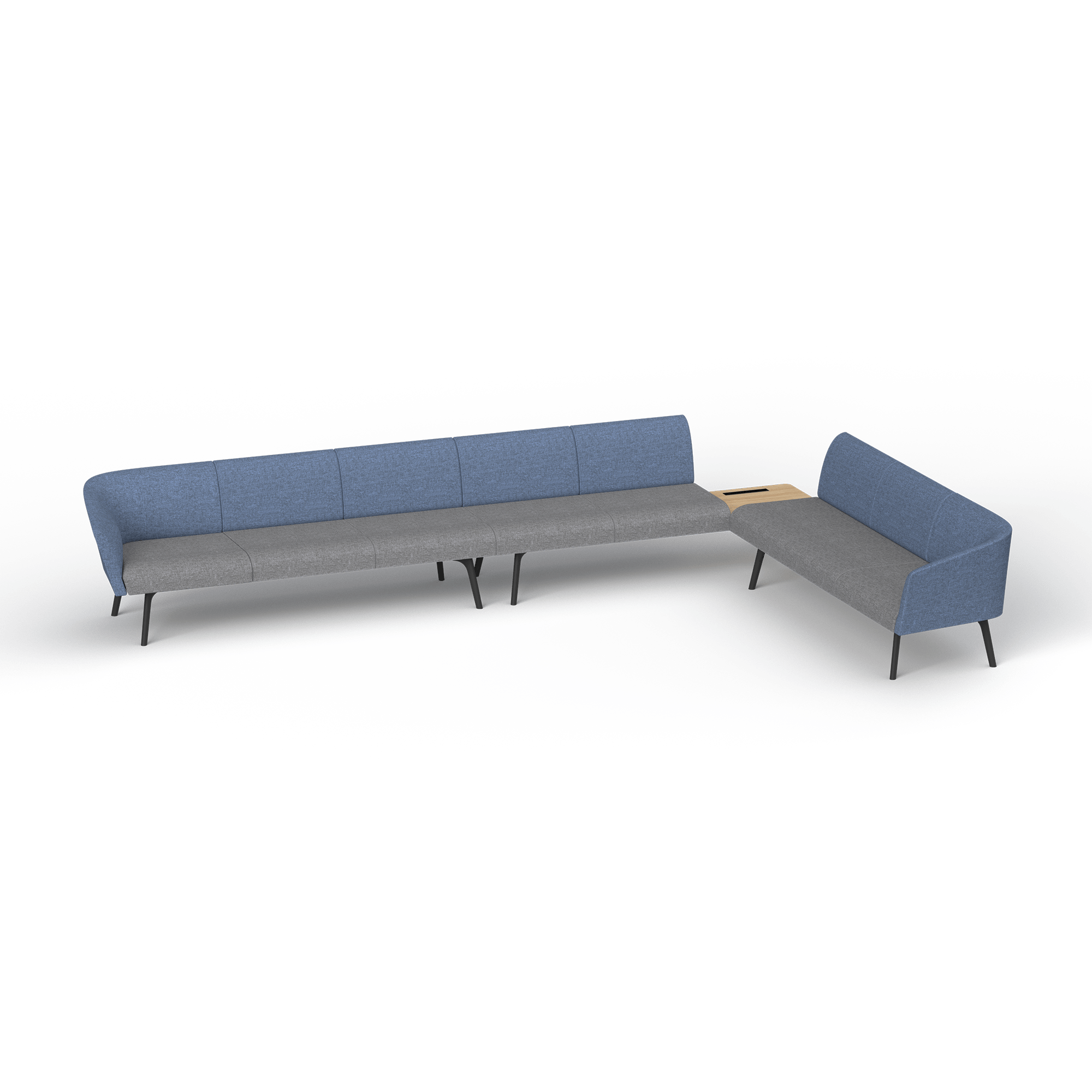 Willow adapts to the way we work, offering a unified language across modular lounge pieces and privacy booths. Configuration 10 is a pre-designed modular package. A balanced corner configuration combining bench, lounge, and sofa components for a versatile multi-use collaborative zone.